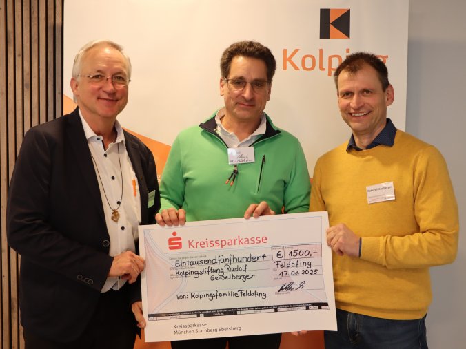 Kolping-Diözesanpräses Wolfgang Kretschmer (l.) und Kolping-Diözesanvorsitzender Robert Hitzelberger (r.) freuen sich für die notleidenden Menschen in der Ukraine und in Indien über die Spende der Kolpingsfamilie Feldafing, die Vorsitzender Andreas Hollwich (m.) an die beiden Vertreter der Kolpingstiftung-Rudolf-Geiselberger übergibt.